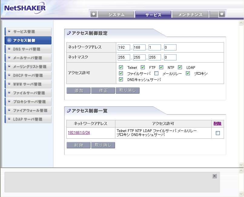 できます。 “メールリレー”が許可されていないネットワークに対しては、外部へのメール送信が禁止されていますので、NetSHAKERに登録されているユーザ同士でのメール送信のみが可能となります。 NetSHAKER管理画面の[サービス]→[アクセス制御]メニューで以下のように設定してください。